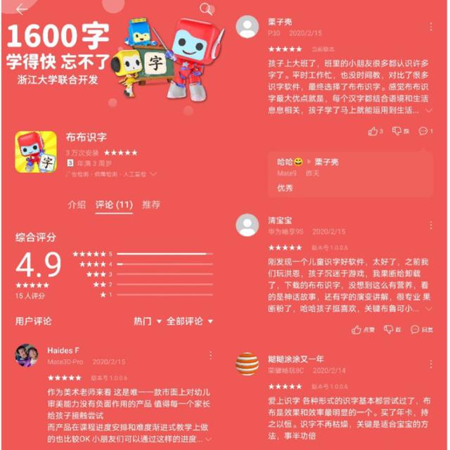 上线仅数日,就有不少华为用户在华为应用市场为《布布识字》从产品UI设计到产品功能,再到“汉子思维”的全方位点赞。